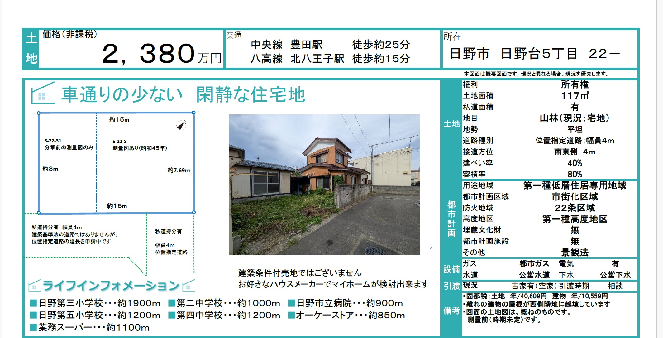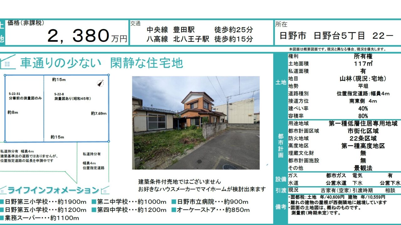 弊社にて日野市日野台5-22-8にある売地 2,380万円をお預かりしました。