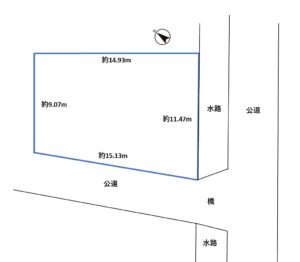 南側に水路と道路があり、開放感があります。